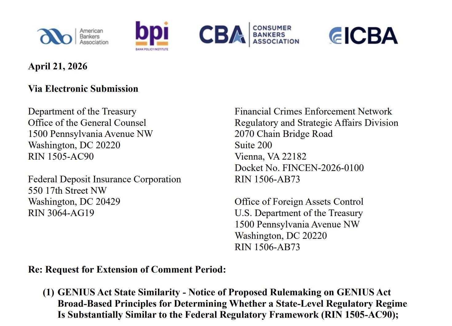 In a Tuesday letter to the US Treasury Department, Federal Deposit Insurance Corporation (FDIC), Financial Crimes Enforcement Network (FinCEN) and Treasury’s Office of Foreign Assets Control, the ABA requested the agencies extend the deadline for public comment on rules for the GENIUS Act, a stablecoin payments bill signed into law in July 2025.
