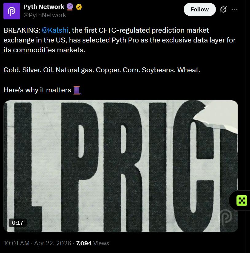 Kalshi’s commodities hub allows users to trade event contracts linked to physical assets, including gold, silver, oil, copper and key agricultural products. Pyth’s price feeds will serve as the source of truth for determining contract outcomes.