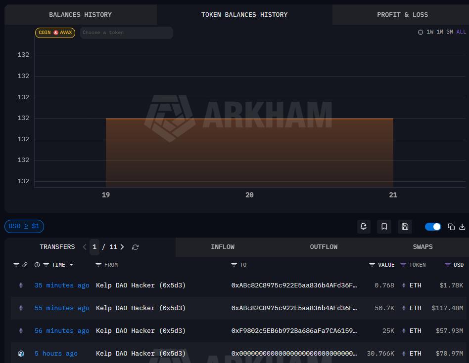 The wallet tagged by Arkham as linked to the Kelp DAO exploit moved about 75,700 Ether (ETH) worth roughly $175 million across three transactions on Tuesday, including a 25,000 ETH transfer to one newly created address and transfers of 50,700 ETH and 0.7 ETH to another.